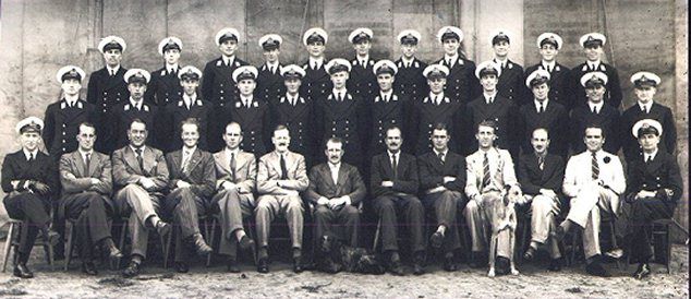 Rathrorne, Higgins, Oliver, "Self", Kirchner, (C.I.) Tatnall, Hymans, Stanard, (C.G.I.) ?, Jamieson. My pupils were Delafield, Martin, Bramah, and Watts. [Derek Martin (fourth from the left, top row) resigned from the R.N. in 1966 as a Lt. Cdr. He was shot down over Norway and, later in the war, was a P.O.W. at the same camp as me - Stalag Luft III, Sagan. He now lives in Devon. His uncle, who I also met at Gravesend before the war, was my A.O.C. for a short while.] |