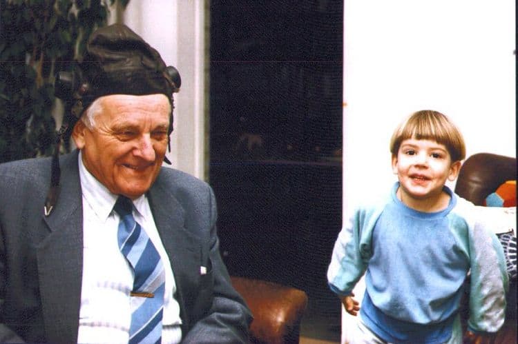 | The photo that Charles Manders sent to me showing him wearing the helmet and accompanied by his grandson. |