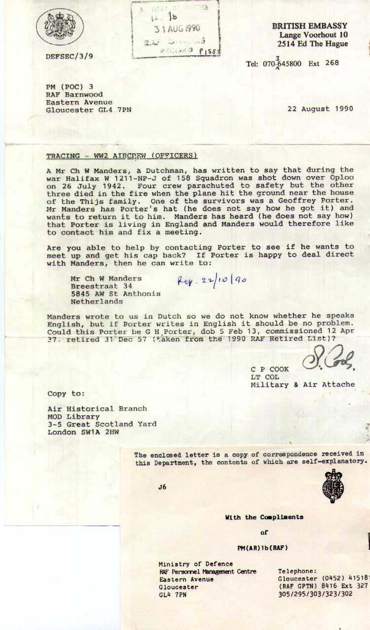 | In September, 1990, The British Ministry of Defence contacted me that a Dutchman by the name of Charles Manders had the flying helmet that I had been wearing when I was shot down and wished to return it to me. My son, Peter, now has the helmet, which is still in excellent condition. |
