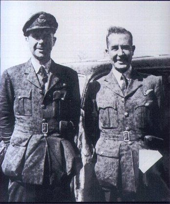 | F/Lt Jimmy Paxton & self with commandeered Police car after our release on 3rd May, '45. (Taken with a confiscated camera & old pre-war film.) |